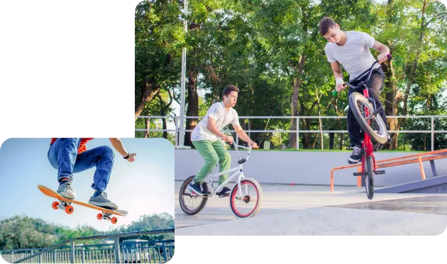 アーバンサイクルスポーツを楽しめる初心者から上級者まで楽しめる本格BMX・スケートボードコースを完備。