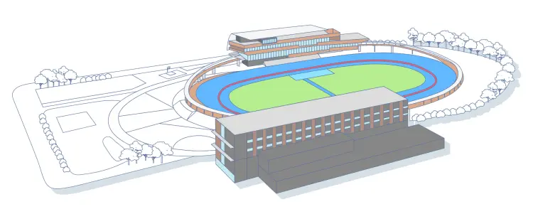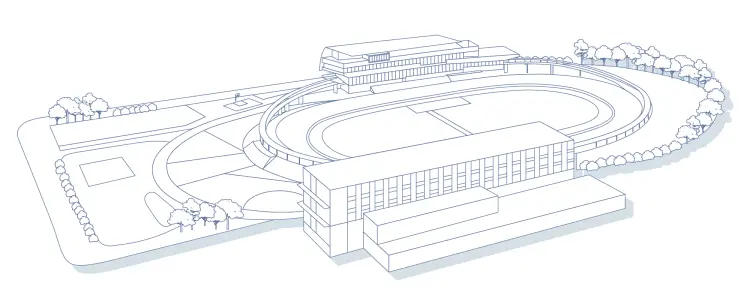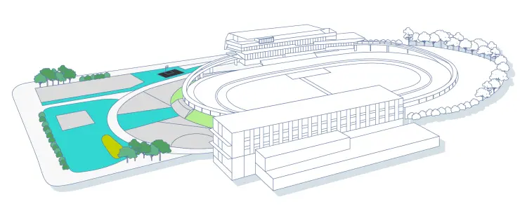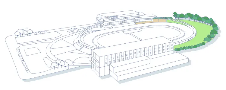 隣接エリアにサイクリスト向けホテルも。競輪観戦を間近で楽しめるスタンド棟と、空中歩廊を併設。
