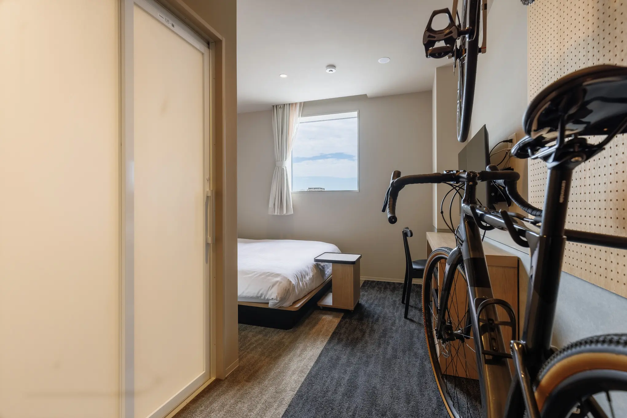 サイクリストの快適な滞在を第一に考えた客室を設けています。シングル、ダブルなどの全客室に、愛車をそのまま持ち込めるサイクルハンガーを設置。大切な自転車とともに安心してリラックスできる空間を提供します。南側客室はバンクビューが楽しめる、競輪場ならではの客室となっています。