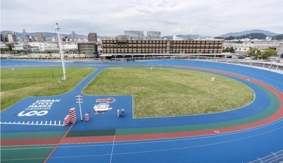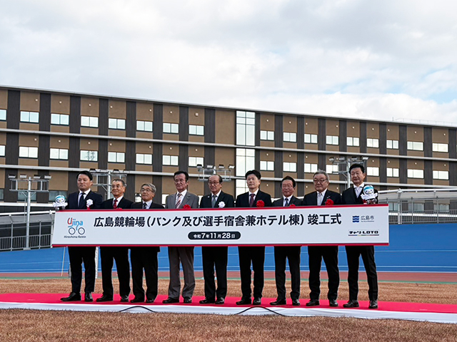 競輪とアーバンサイクルスポーツが融合する複合施設「アーバンサイクルパークス広島」の新バンク・選手宿舎兼ホテル棟が令和7(2025)年11月28日(金)に竣工